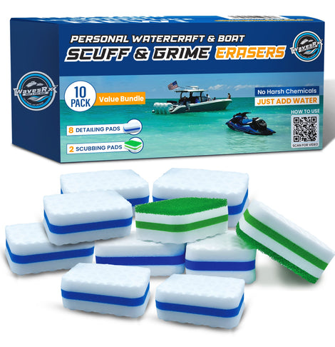 • EASILY REMOVES MARKS, SCUFFS AND DIRT! WavesRx premium marine eraser pads Quickly and Effectively remove Dirt, Grime, Grease, Mud, Scum, and Scuffs from your Boat, Jet Ski or PWC. They easily lift away marks left by shoes, rubber hoses, fishing poles, tackle boxes and coolers. Once you try our magic boat eraser pads, you’ll never go back to your old cleaning supplies.